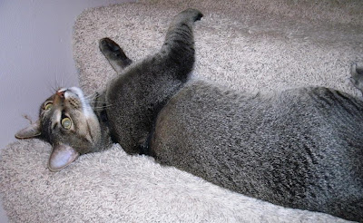 OK...this has to be one of my all time favorite cats besides Cloudy, Peeko, Slick and Shadow. This is Taz. He is not only a beautiful looking cat but he has the most loving nature. Pet sitting for him is a pleasure. I think he thinks he is a dog! He loves to play on the stairway and sometimes forgets himself and does summersaults down the steps because he is so excited. He will follow me wherever I go and just keep plopping down at my feet begging for some love and scratching. He is so much fun that I hate to leave him. He stares at me out the door when I leave and it makes me want to go back in and love him some more. I have to remind myself that cats sleep a lot so he won't be lonely all the time!